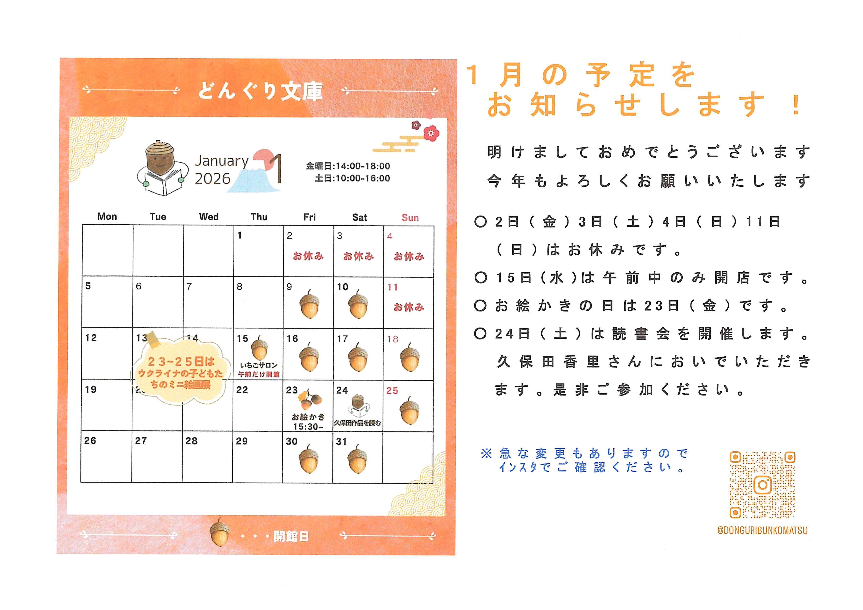 ぷらっとにて営業中の「どんぐり文庫」のイベント予定を掲示します →どんぐり文庫の営業予定表(1月) →