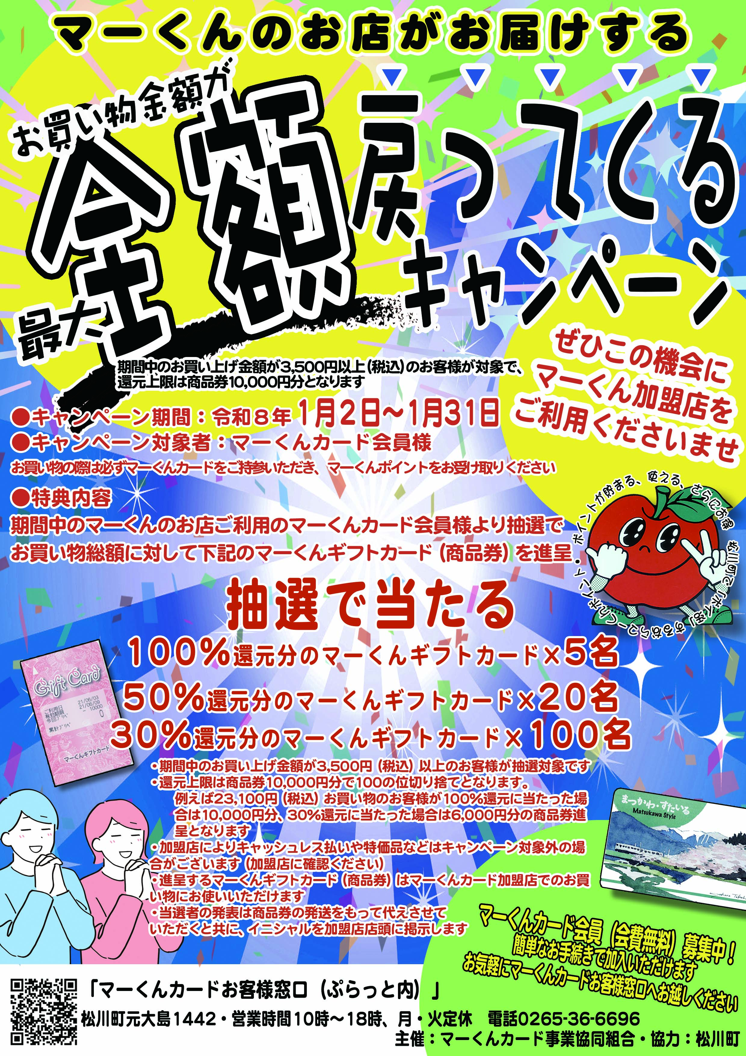 お買物金額が戻ってくる (還元上限10,000円相当の商品券)マーくんカード加盟店で総額3,500円(税込)以上のお買物をされたカード会員様に、