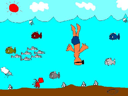 そうこうするうち海は父さんは立てるが長男にはぜんぜん足のつかないところへ。「あれサザエじゃない?採ったらじいちゃんに自慢できるよ」「ヴン、びっでぐるびょ(水中メガネをかけたまましゃべっているので分りにくいがおそらくウン、行ってくるよ)」…「やった〜採れたじゃん。ほらここぜんぜん足つかないでしょ」「びゃっびゃ〜(多分やった〜)」
