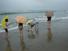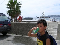 そんなショックもあって午前中は海で泳がず、島探検をしました。周囲5qをのんびり歩き、島の資料館や観光スポットなどを見て歩きました。島の文化や生活がよくわかってとても面白かったです。また、いつも泳いでいるのと違う東浜も、面白そうだと意見がまとまりました。そこで午後は東浜で泳ぐことにしました。