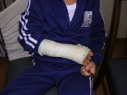お友達と追いかけっこ中、なんと木に登って逃げようとして1m50pくらいのところから転落したようです。腕から落ちたのは幸いと言えば幸いか、右手首を強打していました。最初は両方の手が痛いと(落ちたショックも大きかったようですが)泣いていました。でもシップを貼ってしばらくしたら、泣き止んで元気を取り戻したように見えていました。しかし夜中、痛さのために何度か目を覚まし、翌朝になっても痛みがひかないので整形外科に連れて行きました。レントゲンを撮って、診察室で告げられたのが冒頭の言葉でした。