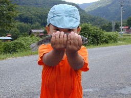 釣りを終えてバケツの魚を逃がす時悲劇が起こりました。普段なら釣れた魚を慈しんで一匹ずつ手で放流するのですが、今回はそうはいきません。ハオコゼに触ると危ないので、バケツをひっくり返して放流しようとしたのですが、次男は片方の手の親指がバケツの内側に少しはみだした状態で縁をにぎり、その手を下にしてひっくり返したものだからハオコゼが流れ出るときに親指にとげが引っ掛ってしまったのです。見る見る腫れ上がる親指に泣き叫ぶ次男。じいちゃんの処置が適切だったことと、深く刺さっていなかったことが幸いし、大事に至らず昼前には腫れもひきましたが、大騒ぎでした。