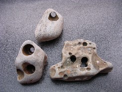 ここは昨年同様カニや貝の採り放題。次男はやっぱりカニをとりまくり、カニパラダイスを作っていました。長男もいっぱいいろんなものを採りましたが、それ以上に長男の心を惹きつけたのは石でした。きれいなポットホールのいくつも開いた石で、自然の奇跡が生んだ芸術作品のような石です。(ポットホール・うず巻のために小石が回転して岩底にできたなべ状の穴のこと。急流の場所で岩底に割れ目や穴があると、水の流れによって軟らかい部分がけずられ、できたくぼみに小石が入り込み、その小石が渦によってくぼみの中を転がって円形の穴ができる)いくつも見つけた中から特に気に入ったものを拾ってきて、これも夏休みの一研究に加えたようです。