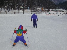 さぁ父さんと練習しよう。練習ベルトのおかげでイメージはつかめているようですが、ベルトにすっかり頼る癖がついてしまいました。腕のひきつけと足の振り上げがまったくだめです。