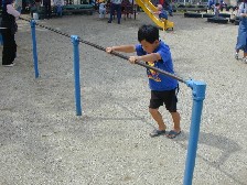 まずは腕のひきつけから。斜め懸垂みたいなことをしながらタイミングをつかみます。そして足の振り上げ。どうしても前方に勢いが逃げてしまうようで体が上方に浮きません。そこで父さんからのアドバイス。
