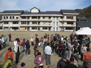午前11時30分、エキストラ約1000人が大鹿小学校に集合。ほぼ大鹿村人口に匹敵するエキストラが大集合ですから、すごい賑わいです。本当の歌舞伎公演でもおよそ1000人の人出は普通らしいので、大鹿村の方にとってはたいしたことはないのかもしれませんが、平素の大鹿村しか知らない私達にとってはびっくりの光景でした。