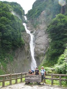 着いてビックリ!これはいい。落差はなんと350m。四段の迫力満点の絶景です。これだけ大きいので、離れた所からも見ることはできますが、直下の橋から見上げるのが最高。水しぶきでじっとり濡れますが、それがまたこの猛暑に最高に気持ちいい。これはいいものを見たと大満足で立山駅に戻り、片道をスタートさせます。
